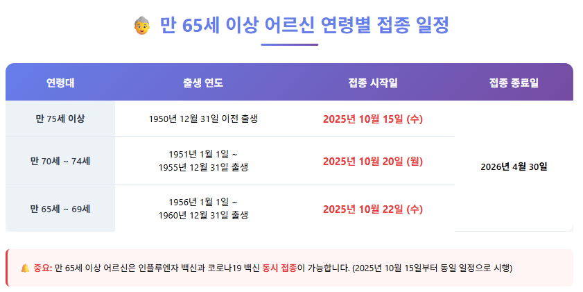 | 만 75세 이상 (1950.12.31. 이전) | 2025년 10월 15일 (수) | 2026년 4월 30일 |